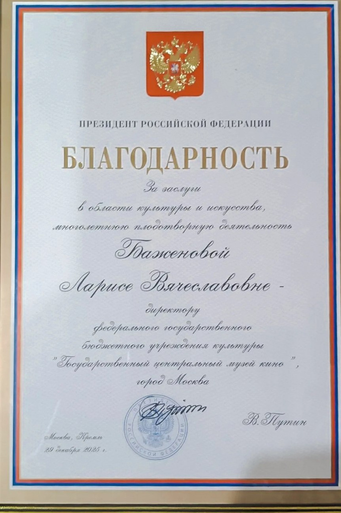 Для Государственного центрального музея кино это особое и по-настоящему радостное событие. Благодарность Президента Российской Федерации — не только личная награда Ларисы Баженовой, но и знак высокой значимости всей той работы, которая ведется музеем.