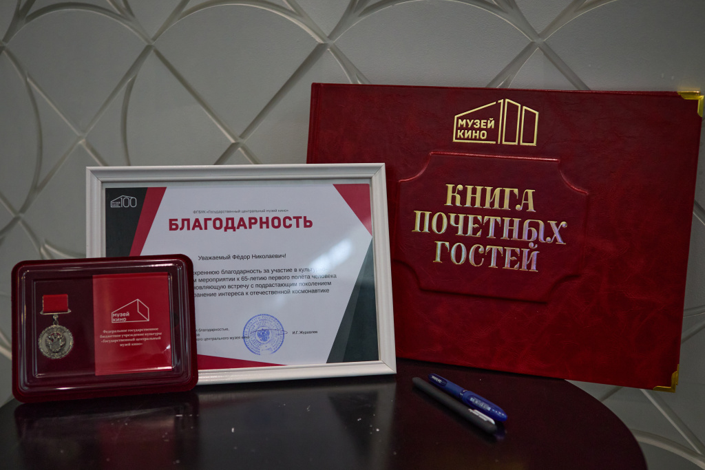 Во время встречи Илья Геннадьевич вручил Фёдору Николаевичу первую памятную юбилейную медаль Музея кино, изготовленную к столетию культурного учреждения. В дальнейшем такими медалями руководство музея будет отмечать людей, чьи заслуги особенно важны для Музея кино.