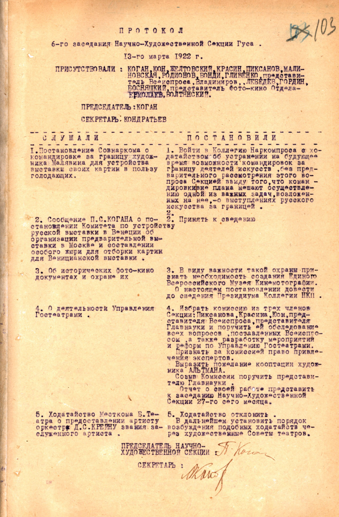 Благодаря усилиям и энтузиазму Болтянского и его товарищей, удалось поднять вопрос о создании Музея кино на высоком уровне. На заседании Научно-Художественной Секции Государственного учёного совета Народного комиссариата просвещения 13 марта 1922 года рассмотрели тему «об исторических фото-кино документах и охране их», а также «ввиду важности такой охраны» признана «необходимость создания Единого Всероссийского Музея Кинематографии». Начало пути было положено.