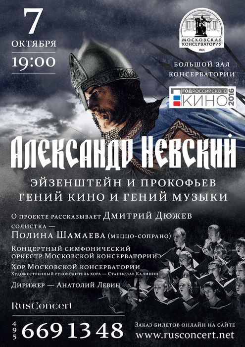 7 октября в Большом зале Московской государственной консерватории имени П.И. Чайковского в 19 часов состоится концерт «Александр Невский. Эйзенштейн и Прокофьев». В программе - показ фрагментов фильма «Александр Невский» (1938) Сергея Эйзенштейна с исполнением музыки Сергея Прокофьева.
