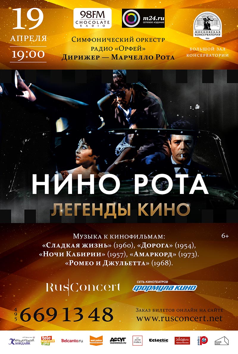 19 апреля 2016 года в Большом зале Московской государственной консерватории имени П.И. Чайковского при участии Государственного центрального музея кино пройдёт настоящий музыкальный праздник – концерт произведений одного из крупнейших кинокомпозиторов XX века – легендарного Нино Роты.