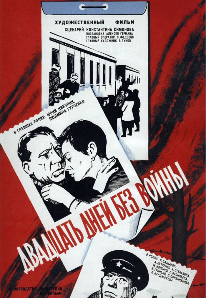 В 18.30 в программе лектория - фильм Алексея Германа «Двадцать дней без войны» (1976). Картина поставлена по повести Константина Симонова «Из записок Лопатина», он же написал сценарий и читал за кадром текст от автора. В Госкино СССР долго не хотели принимать фильм, в конце концов, ленте присвоили вторую категорию и через год малым тиражом выпустили на экраны. В 1977 году картина получила во Франции премию им. Жоржа Садуля, присуждаемую ежегодно, а в 1987 году – премию критиков на Международном кинофестивале в Роттердаме (в совокупности с другими фильмами режиссера – «Проверка на дорогах» и «Мой друг Иван Лапшин»). Главные роли в фильме исполнили Юрий Никулин и Людмила Гурченко.