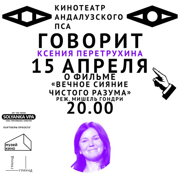 Если вы еще не видели фильм «Вечное сияние чистого разума», то мы вам завидуем, ведь у вас впереди невероятное открытие, которое может случиться совсем скоро в нашем «Кинотеатре Андалузского пса». А если вы уже знакомы с этой прекрасной работой Джима Керри и Кейт Уинслет, то приходите послушать художника, режиссера и сценариста Ксению Перетрухину, она поделится своим взглядом на кинокартину, пленившую сердца многих.