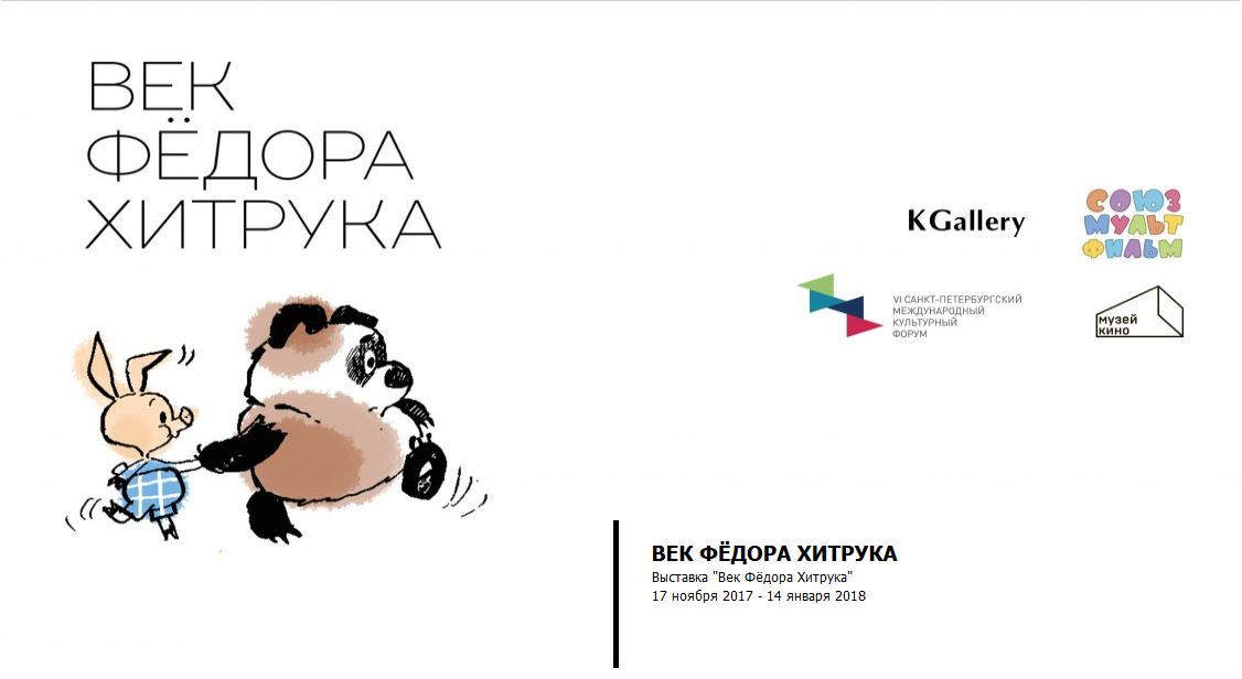 С 17 ноября 2017 по 14 января 2018 года в петербургской галерее KGallery для всех любителей советской мультипликации пройдет выставка "Век Фёдора Хитрука", приуроченная к столетнему юбилею режиссёра-мультипликатора, автора шедевров советской мультипликации "История одного преступления" (1962), "Топтыжка" (1964), "Каникулы Бонифация" (1965), "Фильм, фильм, фильм" (1968), и, конечно же, "Винни Пух" (1969). В экспозиции представлено 147 предметов из коллекции Государственного центрального музея кино.
