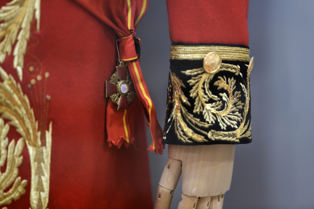 На примере фондовых предметов двух музеев выставка рассказывает о технологии и истории промысла, а также его отражении в кинематографе. Среди жемчужин экспозиции - камергерский мундир Алексея Каренина, парадная форма Вронского и костюмы из фильма «Сибирский цирюльник». Всего на выставке представлен 41 экспонат из фондов Центрального музея кино, а также уникальные образцы золотного шитья из фондов ВИЭМ.