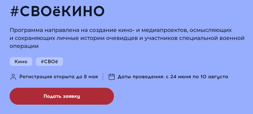 Одно из направлений программы — #СВОеКИНО — адресовано сценаристам, режиссёрам, продюсерам, создателям интернет-контента, кинематографистам, участникам и ветеранам специальной военной операции, а также членам их семей старше 18 лет. Регистрация на направление открыта до 8 мая 2026 года.