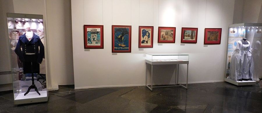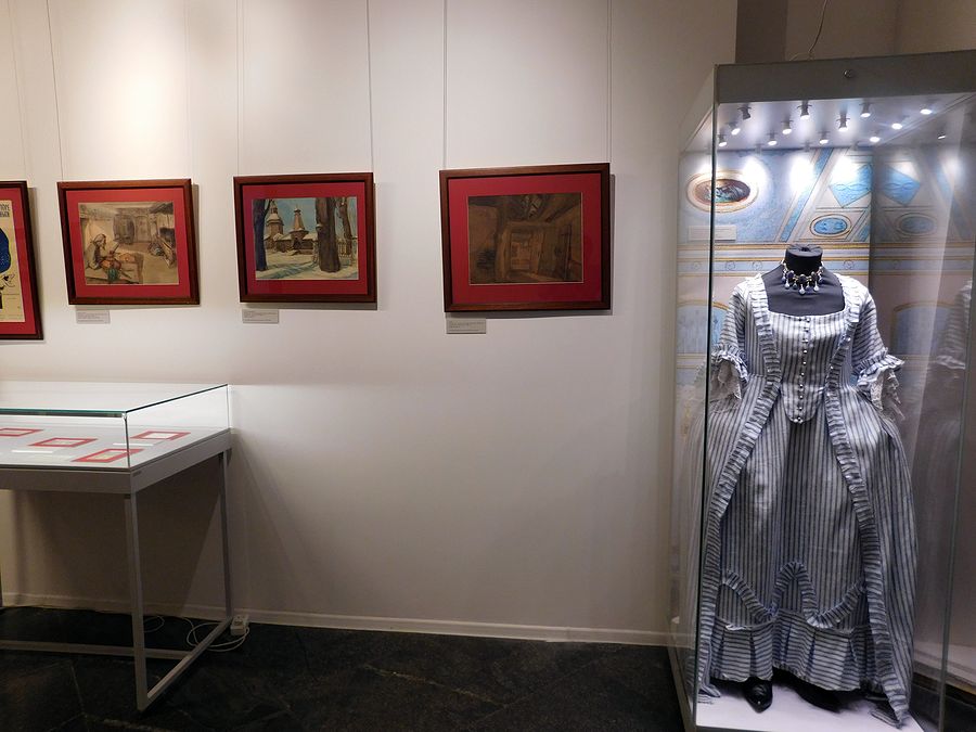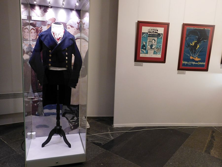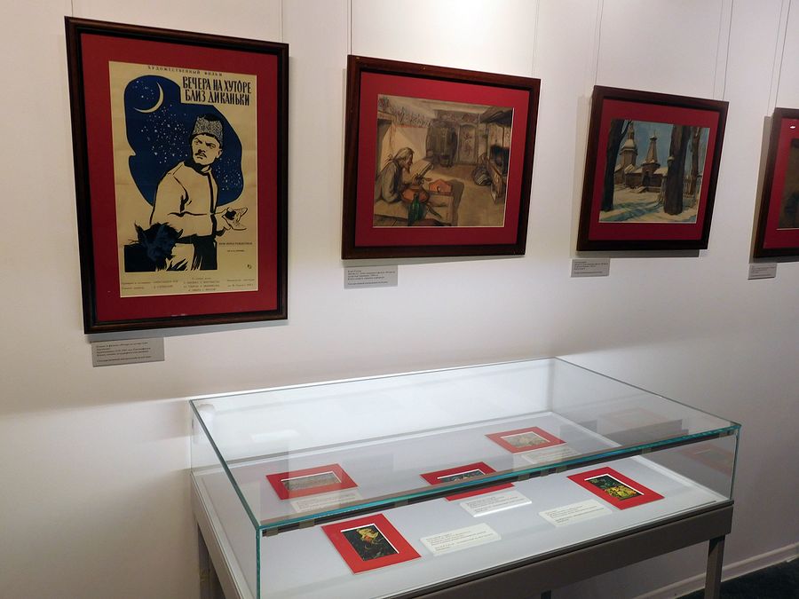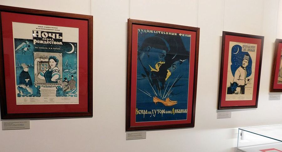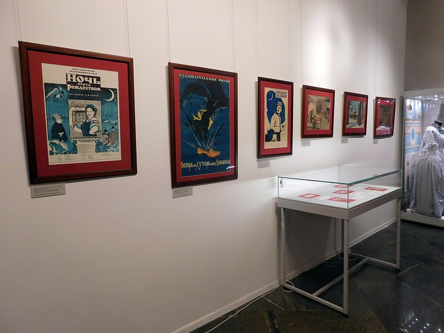 Выставка Музея «Бородинская битва» собрана из различных коллекций - киностудии «Союзмультфильм», Государственной публичной исторической библиотеки, Дома-музея Н.В. Гоголя и частных коллекционеров. «Из предметов быта, артефактов и реплик исторического материала организаторы создали интересную инсталляционную выставку, - рассказывает учёный секретарь Музея кино Ирина ПАВЛОВА. – В этой тщательно продуманной, изящной экспозиции подлинные вещи из коллекции Государственного центрального музея кино занимают особое место. Ведь подлинная вещь не столько отражает само произведение, сколько время, в котором она создана. Среди предметов Музея кино - плакаты художников А. Лещенко и Н. Клементьевой, эскизы декораций, костюмов к мультфильму сестёр Брумберг «Ночь перед Рождеством» (1951, киностудия «Союзмультфильм») и художественному фильму А. Роу «Вечера на хуторе близ Диканьки» (1961, Центральная киностудия детских и юношеских фильмов им. А.М.Горького). И, конечно, ключевой экспонат, на фоне которого с удовольствием фотографируются посетители выставки – черевички, за которыми кузнец Вакула на чёрте летал в Петербург. Эти туфельки были изготовлены в бутафорском цехе киностудии Горького специально для фильма А. Роу. Разумеется, их никто никогда не носил.