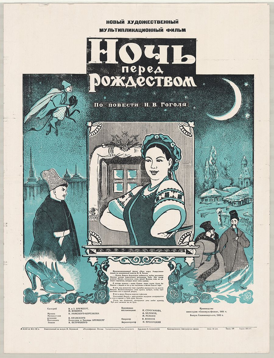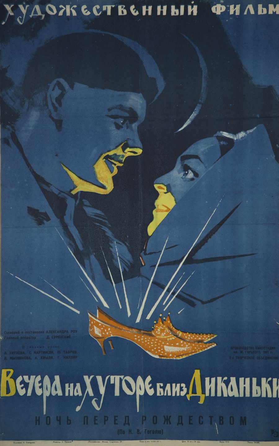 Музей кино представляет эскизы декораций художника А.С. Дихтяра и плакат А.М.Лещенко к фильму «Вечера на хуторе близ Диканьки» (1961, Центральная киностудия детских и юношеских фильмов им.М.Горького); плакат Н.Т.Клементьевой к фильму «Ночь перед Рождеством» (1951, киностудия «Союзмультфильм»). Посетителям экспозиции будет предоставлена возможность увидеть «черевички» царицы, которые кузнец Вакула дарит Оксане.в фильме «Вечера на хуторе близ Диканьки».